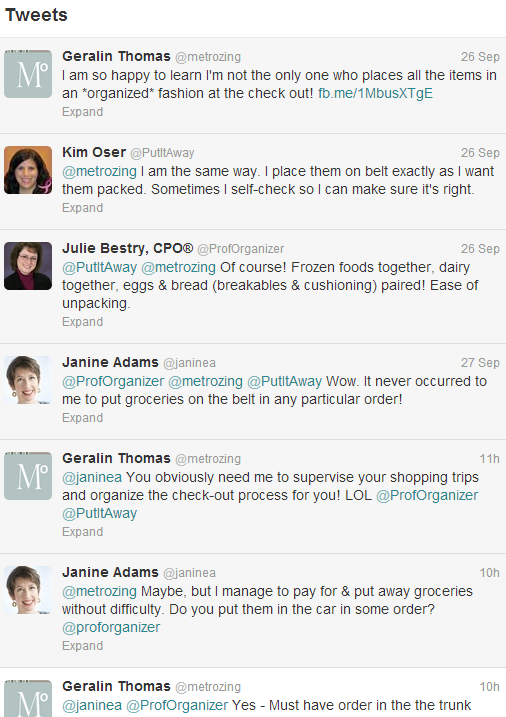 Ladies, I’m late but let me chime in: In Florida, strategic placement of groceries on the belt is the difference between dinner and rotten seafood – because even with a bag of ice and an insulated bag, just getting the stuff through the parking lot and then loaded into my 120 degree car takes 15 minutes and then the dash home and unloading – so I really, really care how the stuff is grouped and packed. We don’t have self-serve grocery check out here (at least not in my hood) so yeah, I’m probably known as the picky lady with the carefully folded assortment of NAPO conference bags and a Tote Buddy.