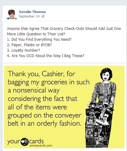 I believe the conversation first started by this card Geralin Thomas posted on Facebook. The Facebook post garnered 155 Likes, 49 Comments and 41 Shares. It also created a multi-day dialogue on Twitter. Comments included everything from cashier insensitivity to “my cashiers rock!” to “I go to self-checkout for this exact reason.” There were many (including myself) that as this “card” states, place our items on the conveyor belt exactly as we would like them bagged.